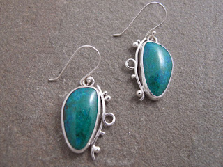 I enjoy the mosaic work, but it's time consuming. And the designs on the newer pieces are light and happy. Lots of curves and swoops, which I love. I also played with some bee-yoo-ti-ful chrysocolla stones:
